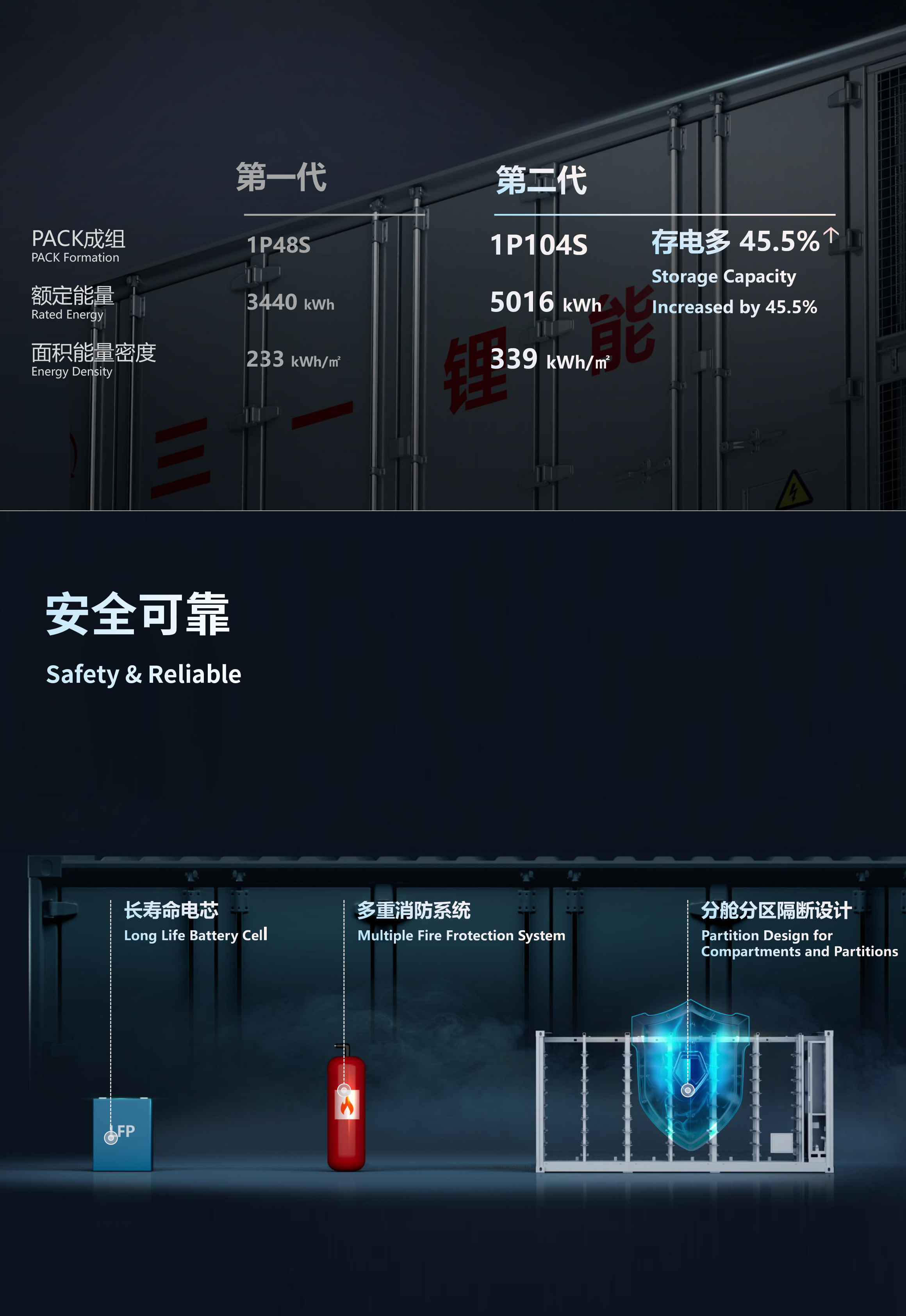 性能(néng)大(da)幅升级:第二代(dai)相比第一(yi)代(dai),存電(dian)容量提升 45.5%(额定能(néng)量從(cong) 3440kWh 增至 5016kWh),面积能(néng)量密度也(ye)從(cong) 233kWh/㎡提高(gao)到(dao) 339kWh/㎡,储能(néng)效率更優(you)。